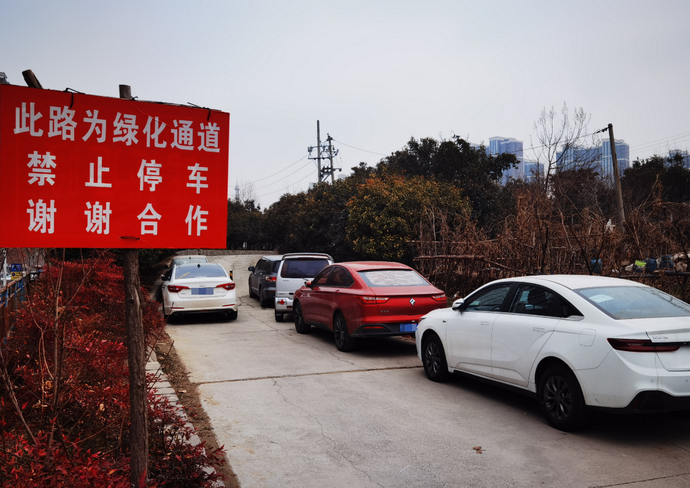 張先生所說的亂停車情況出現在路口東南角區域。3月5日上午9時,記者來到這里時,仍有不少車輛停在金沙江路生態廊道上,鄭密路污水泵站的大門也被汽車堵住。廊道一側雖有綠化管理人員設置的禁停提示牌,但近百米的廊道還是被臨時停放的車輛占據了一半面積。