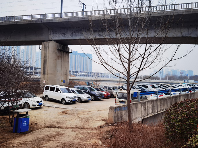 路口向南的金水河大橋東側的輔橋橋面也成為了停車場,30多輛汽車占據了大半橋面,上方鄭西客運專線不時有列車經過,高鐵橋橋墩上也被貼上了“嚴禁停車”的標識,并留下了防災報警電話預防意外情況出現。