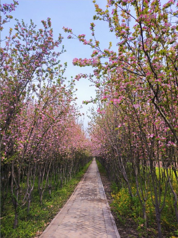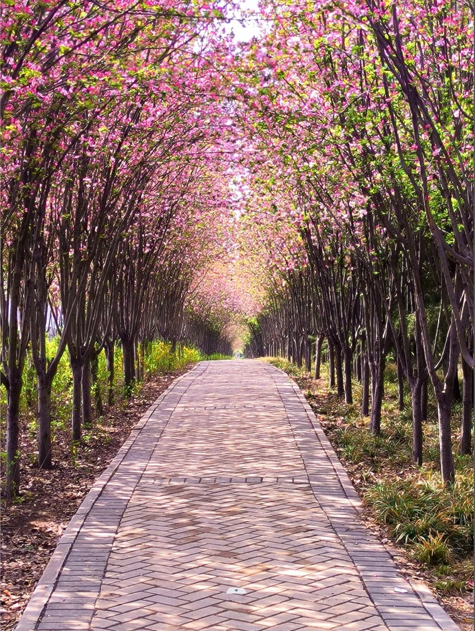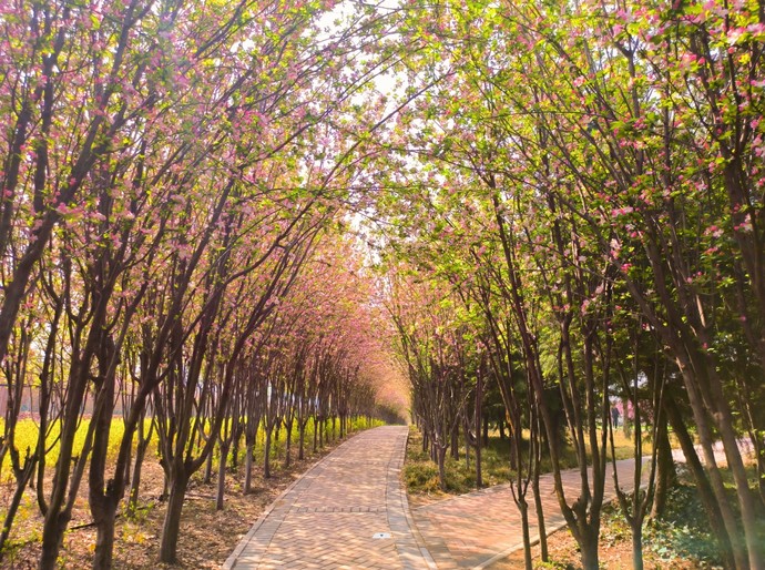 這里不只有海棠一種花,海棠長廊里分岔口的另一條路上種植著一排櫻花,遠遠望去就似粉紅“花海”!這么充滿詩意的地方,值得市民前來游玩,感受花香。