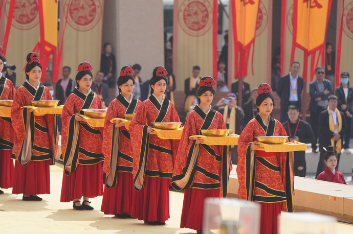 大典共有九項儀程,分別為:盛世禮炮、敬獻花籃、凈手上香、共拜始祖、恭讀拜文、高唱頌歌、樂舞敬拜、祈福中華、天地人和。