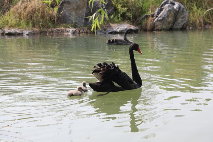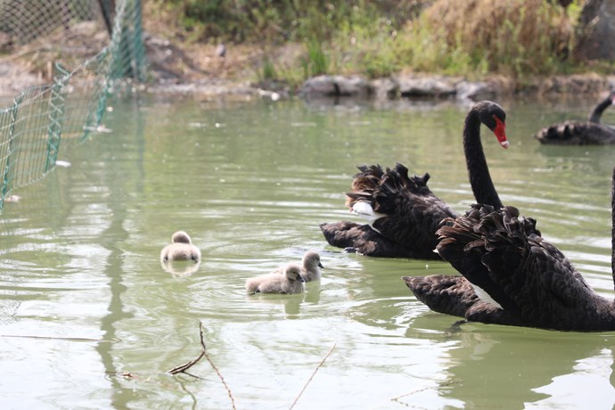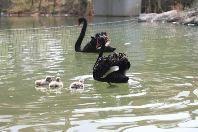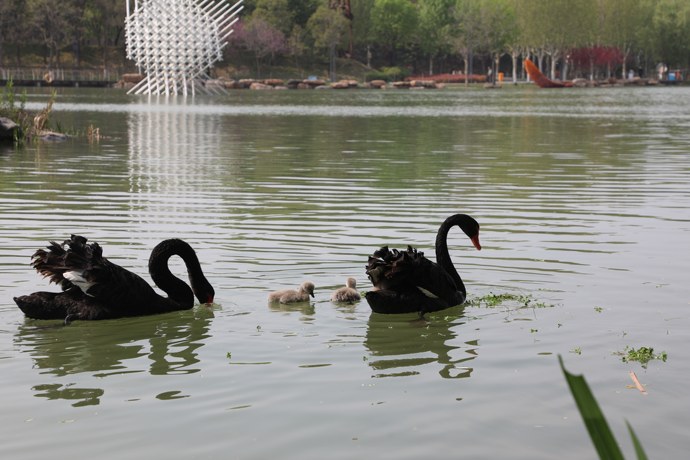 由于園內生態系統不斷完善,鄭州市雕塑公園鳥類繁育成果喜人!近日,園內的黑天鵝夫婦經過40多天的孵化,3只黑天鵝寶寶破殼而出,加上原有的10只成年天鵝,目前雕塑公園的黑天鵝數量已經增至13只。