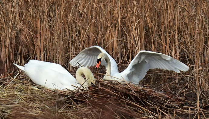 2019年底,疣鼻天鵝“王子”和“公主”來到北龍湖安家,并于2020年首次孵化出6只小天鵝。四年多過去,如今北龍湖已有疣鼻天鵝55只。今年在北龍湖坐窩孵化的天鵝有11對,預計五一前后將會有60只以上幼鵝出生,屆時北龍湖天鵝總數將突破百只。