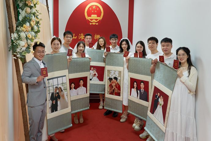 手捧鮮花、身著禮服、滿臉幸福......5月20日一大早,許多精心打扮的情侶早早就來到管城區政務服務中心二樓婚姻登記窗口,共赴甜蜜之約。在現場嘉賓的見證下,6對新人參加了集體結婚頒證儀式,管城區民政局還為6對新人送上了專屬的卷軸畫,儀式感滿滿。