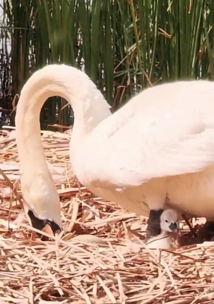 “天鵝棄窩后又重新筑巢產蛋,是非常少見的。一般情況下,每對疣鼻天鵝在繁殖季最多產下9枚蛋,而‘真真’‘象寶’今年兩次做窩,加起來一共產了13枚蛋,這不得不說是一個奇跡。”志愿者高麗說,為了確保“真真”“象寶”能夠順利孵化,相關部門安排專職保安在它們窩附近扎下帳篷,全天24小時守護著這對天鵝,志愿者每天也都來附近巡護,時刻關注著天鵝動態。