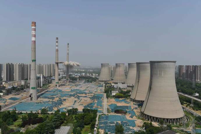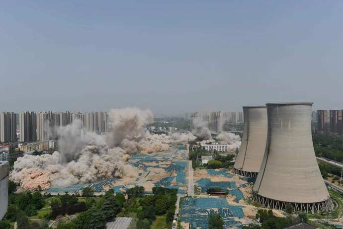 “起爆!”,6月25日上午10時06分,隨著爆破現場總指揮一聲令下,“嘭嘭嘭……”幾聲悶響,位于鄭州西區的鄭州新力電力有限公司(以下簡稱鄭新熱電)三根高210米的煙囪和三座高105米的涼水塔同步起爆,6個高大的標志性建筑朝預定方向倒塌落地。至此,這顆曾經光耀鄭州西區的電力明珠徹底退出歷史舞臺。