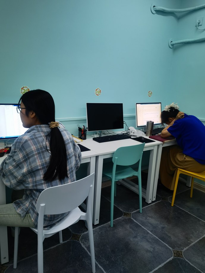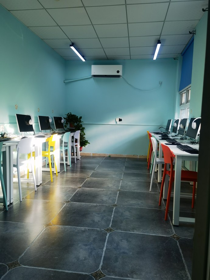 兩間自習室,藍綠色墻面,黃綠白紅不同色彩的椅子襯托得清新明快。桌上依次擺有11臺電腦,每臺電腦上配有一部耳機。