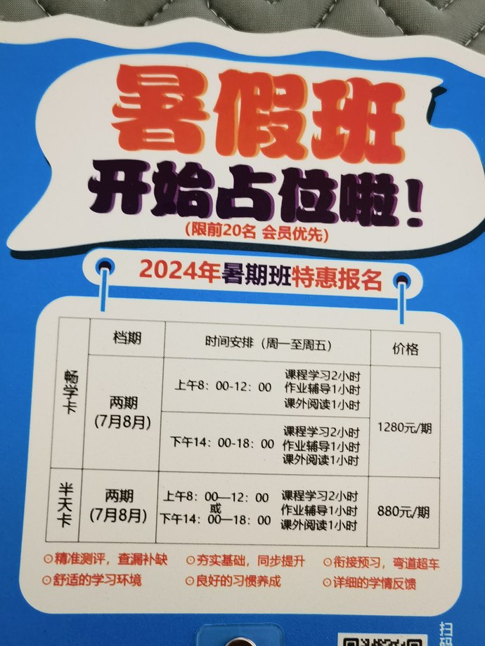 在另一家自習室門口看到,牌子上寫著“精品暑假班”,四到九年級,全學科,查漏補缺;小升初預科,個性化指導。這里的老師強調,她們這個自習室有別于傳統的那種輔導班和網課,她們的AI系統是比較有針對性的,雖然也主要靠學習機學習,但線下老師有四個,可以幫孩子制訂學習計劃。針對暑期,該自習室專門推出“暢游卡”,9000多元,不限時間、不限次數。