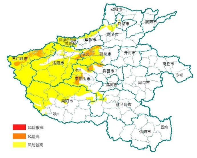其中,橙色預警地區:豫西小秦嶺、崤山山區,豫西黃土丘陵區,豫中外方山山區發生崩塌、滑坡、泥石流地質災害的可能性大。