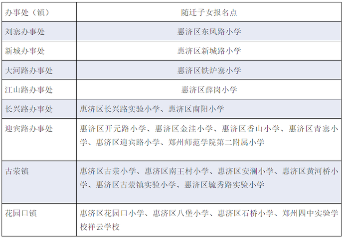 二七區城區設置20個報名點接受進城務工人員隨遷子女報名。報名點具體安排如下: