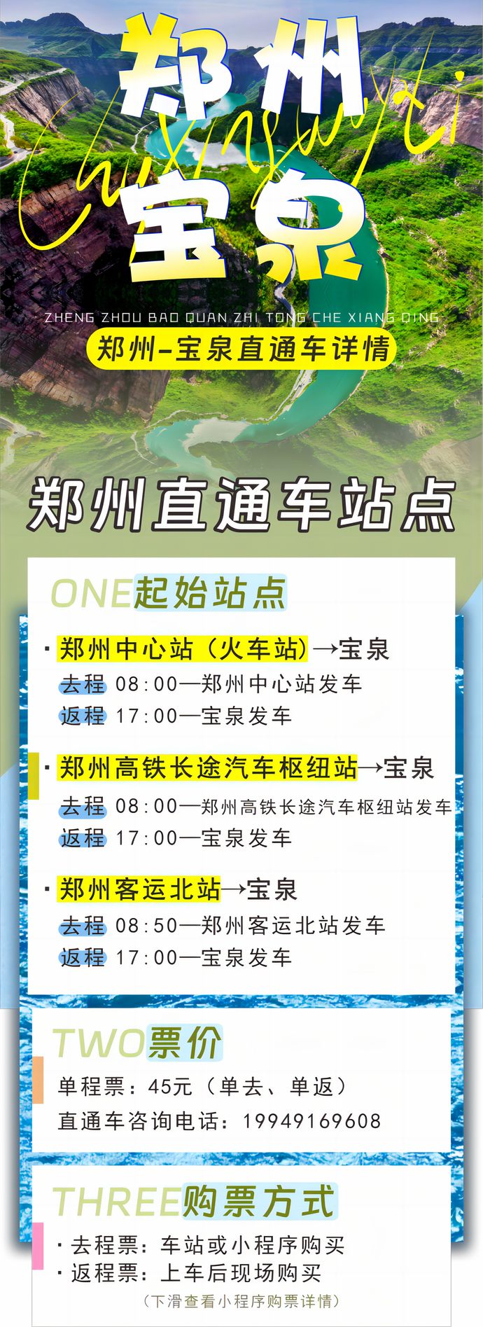 去程 8:00鄭州高鐵長途汽車樞紐站發車;返程 17:00寶泉發車
