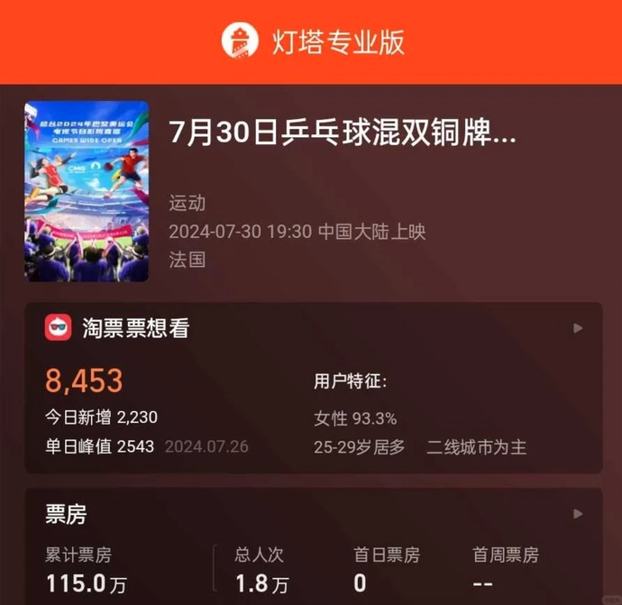 本次“影院看奧運”活動自2024年巴黎奧運會開幕式首場直播開始,無數觀眾在銀幕之上見證了多位中國奧運冠軍的誕生,其中不乏鄭欽文贏得中國女網首塊奧運單打金牌、乒乓球混雙決賽單場全國票房突破百萬這樣的重要時刻。除此之外,包括男籃、女排、羽毛球等奧運熱點項目也首次實現在電影銀幕上的直播放映。