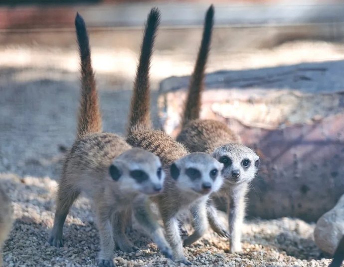 細尾獴(學名:Suricata suricatta),別名狐獴,海島貓鼬,灰沼貍等,是獴科細尾獴屬的唯一物種。細尾獴是高度社會化的動物,構建的是母系社會,其內部統治者是雌性首領和雄性首領,雄性首領由雌性首領選出,雌性細尾獴之間出于競爭有殺嬰現象,所以出于本能獴媽“護犢”的警惕性極高。生產前,獴媽自己挖好“產房”,不允許飼養員靠近產房,一旦飼養員靠近,它就會吼飼養員。分娩后,獴媽時刻把寶寶們護在身體下,不允許任何人靠近。三周后,才會帶它們從“產房”里出來溜達,帶它們學習刨土、打洞、吃蟲子。如今,三只獴寶茁壯成長,精力充沛,十分活躍,白天,它們爭搶打鬧,晚上又疊在一起睡覺。為了幫助獴媽更快地恢復身體,飼養員每天都給它準備了蠶蛹作為加餐。