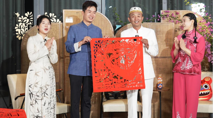通過本次直播,越來越多的人了解了青海花兒背后的故事。直播最后,作為現場觀眾之一的河南非遺新青年、孟津剪紙傳承人暢楊楊展示了他的一幅現場即興創作的剪紙作品。作品以青海段黃河為主體,生動展現了黃河從雪山起源,流經青海廣袤大地的壯麗景象,還有馬俊老師在黃河邊唱響青海花兒的情景,為直播現場增添了一抹亮麗的中國紅。